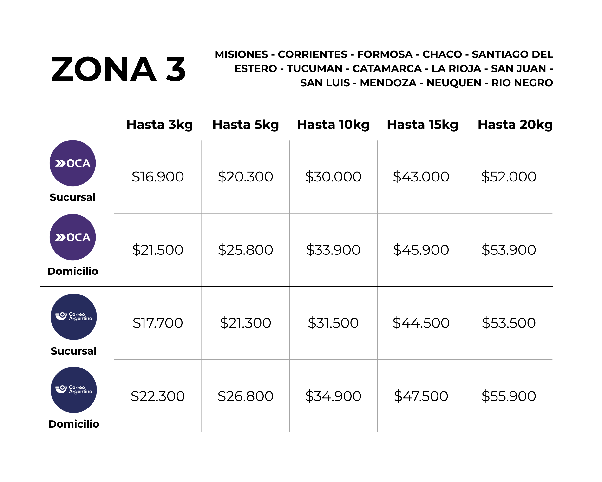 El monto del envío con OCA y CORREO ARGENTINO depende de la zona y el peso del pedido, una vez armado y embalado te pasaremos el importe correspondiente.